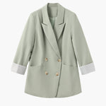 De Scarlett Dubbelzijdige Blazer brengt frisse wind in uw garderobe. Met zijn zachte saliegroen, de klassieke reverskraag, de elegante dubbelzijdige knopen en de contrasterende, gestreepte omslagmouwen is hij de perfecte mix van business-chic en trendy statement. Of het nu bij jeans, een stofbroek of een rok is – deze blazer geeft elke outfit een moderne, vrouwelijke touch.