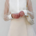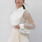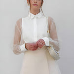 Deze chique blouse met transparante mouwen is de perfecte combinatie van klassiek ontwerp en moderne verfijning. De gestructureerde kraag, de verborgen knoopsluiting en de licht doorschijnende pofmouwen maken het een uitzonderlijk kledingstuk voor speciale gelegenheden of stijlvolle dagelijkse looks.