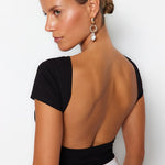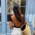 Dit zwarte, rugloze top combineert tijdloos design met een moderne silhouet. De subtiele halslijn en de duidelijke lijnen maken het een must-have voor stijlvolle, zelfbewuste outfits.