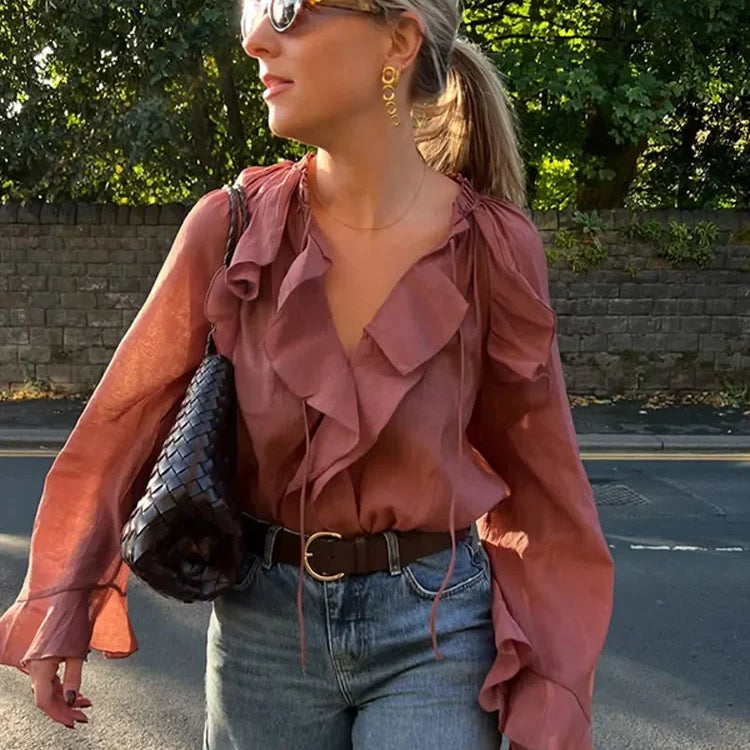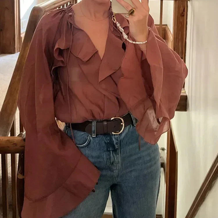 Transparante Volantblouse in Bruin – Feminin, Elegant & Uitgesproken