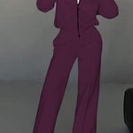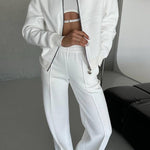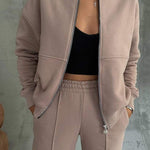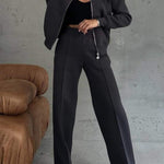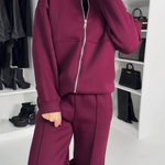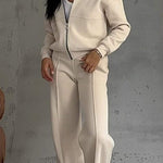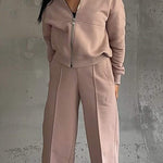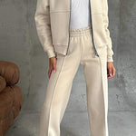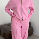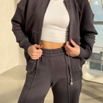 Dit tweedelige loungepak is een perfecte mix van mode en comfort. Het bomberjack met ritssluiting geeft een sportieve, maar toch chique uitstraling, terwijl de wijde jogger zorgt voor een casual, trendy vibe.