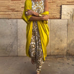 Dit opvallende kaftan-ensemble brengt glamour en comfort samen. De sierlijke gouden broek met een verfijnd patroon vormt een prachtig contrast met de kleurrijke cape, die soepel meebeweegt met elke stap.
