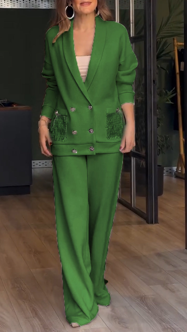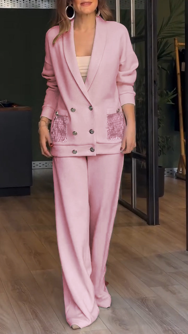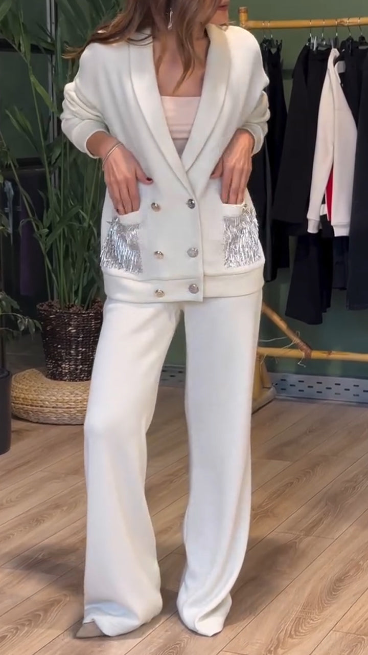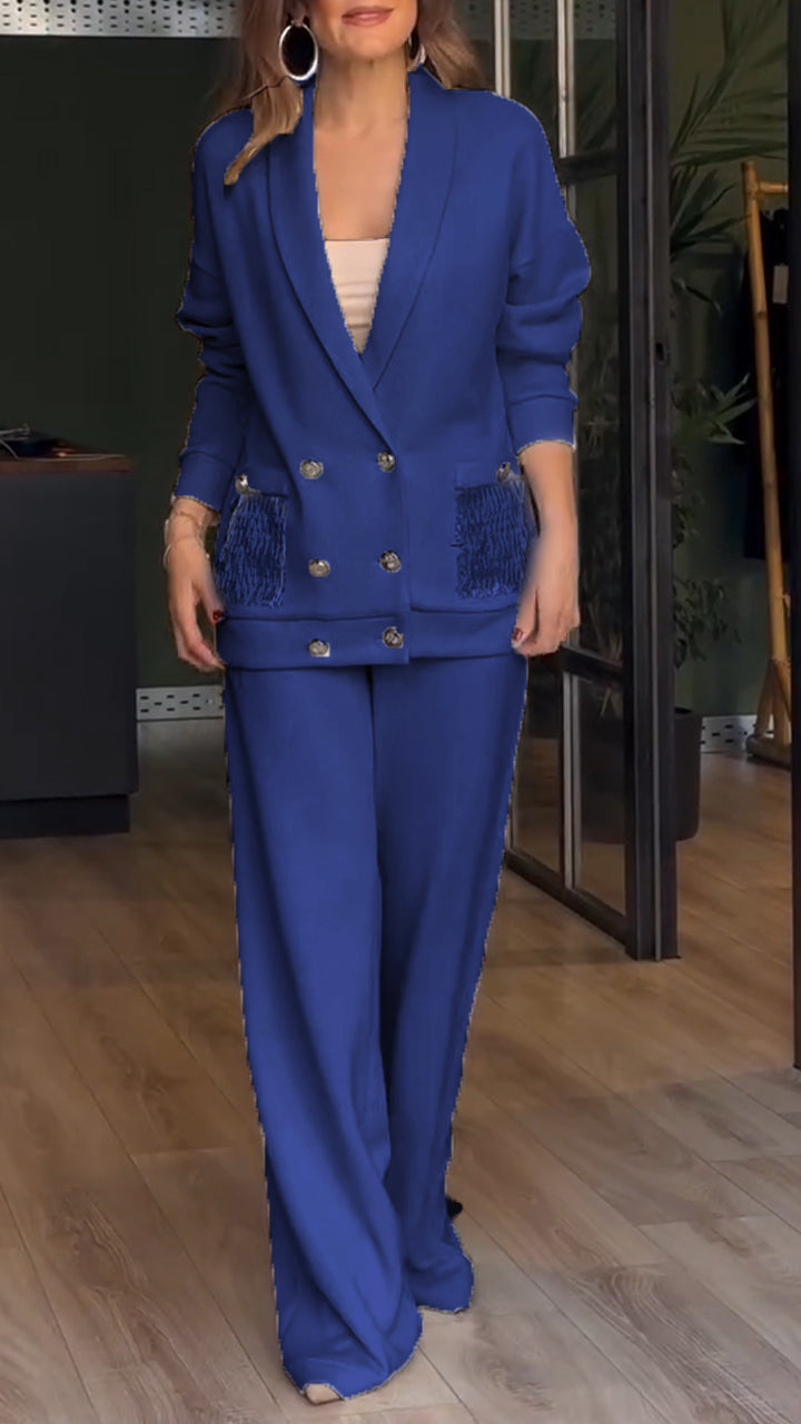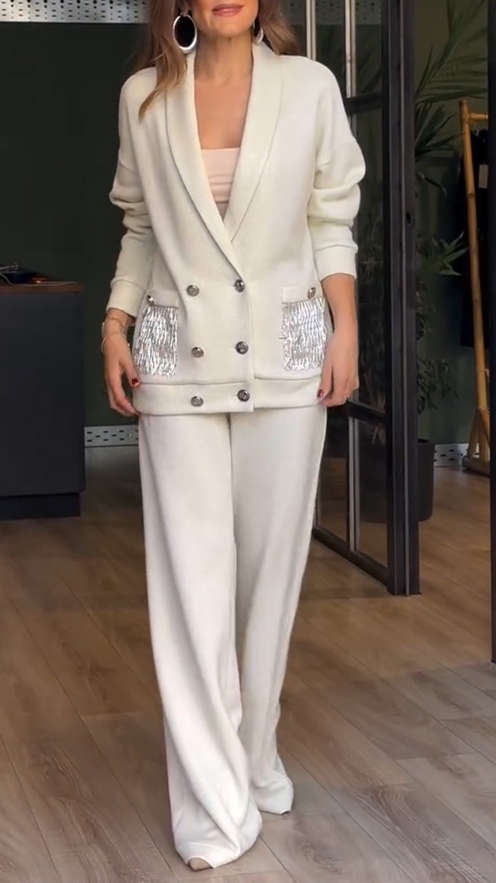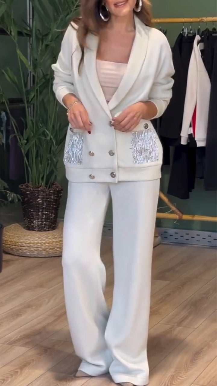 Deze elegante tweedelige set combineert verfijning en comfort. De blazer met diepe revers en decoratieve knopen straalt klasse uit, terwijl de wijde broek zorgt voor een flatterend silhouet en bewegingsvrijheid.