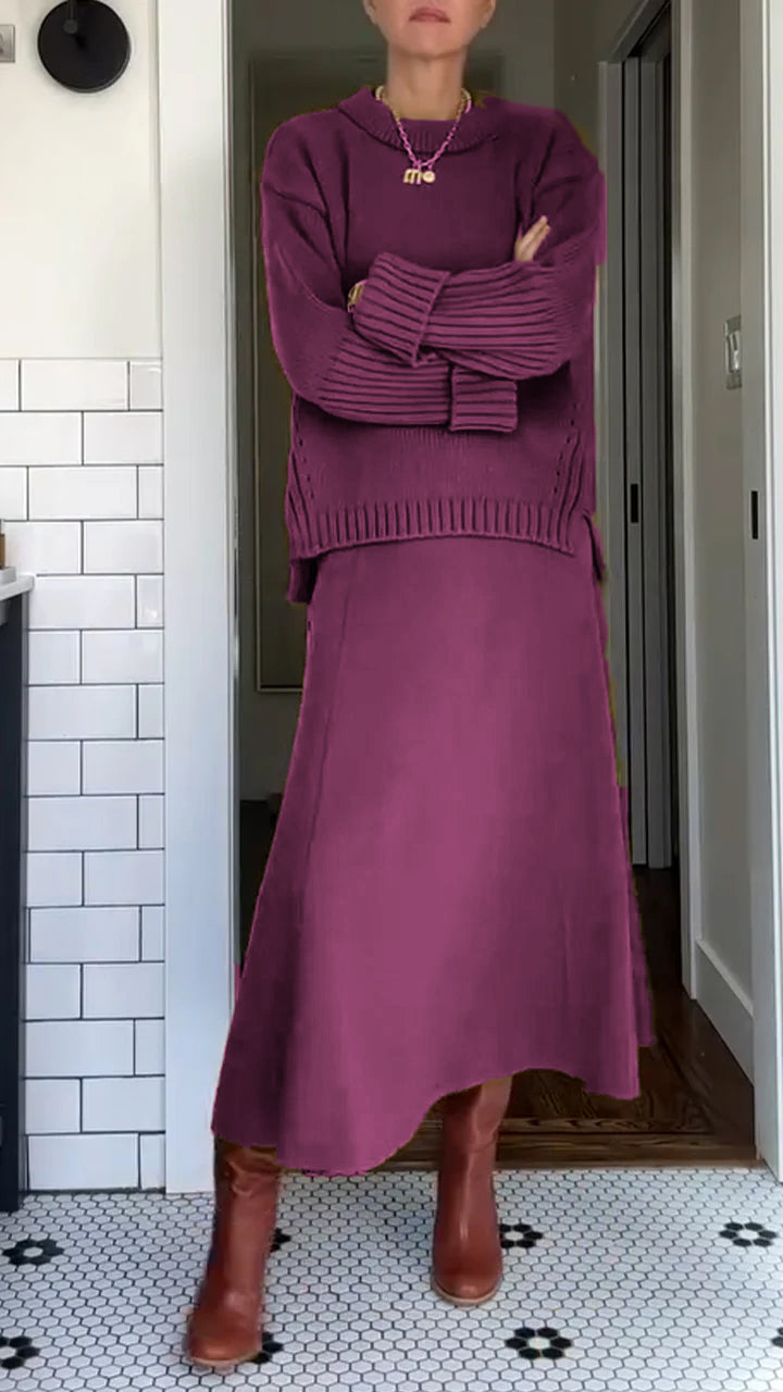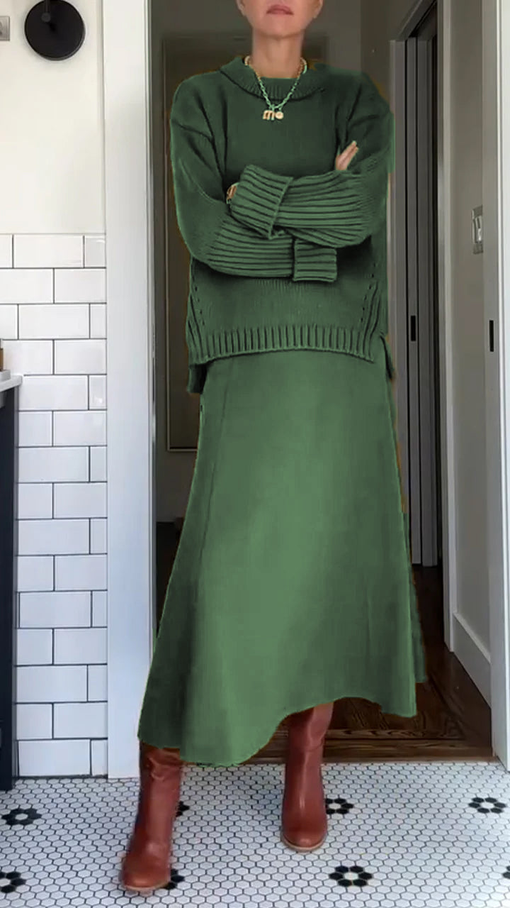 Dit set biedt de perfecte balans tussen trendy en tijdloos. De combinatie van een cosy trui en een elegante rok maakt het een must-have voor modebewuste vrouwen.