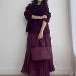 Dit luxe tweedelige damesensemble combineert warmte en elegantie op een unieke manier. De comfortabele, zachte trui sluit perfect aan bij de geplooide midi-rok, die elke beweging elegant accentueert.
