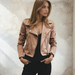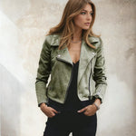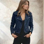 De Hailey Jas brengt rock-chic naar een nieuw niveau. Met haar klassieke biker-snit, de zilveren ritsen en de trendy suede-look in kaki geeft ze elke outfit meteen een moderne, stijlvolle uitstraling.