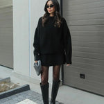 Onze set biedt de oplossing voor kou en stijl. De oversized trui houdt je warm, terwijl de stijlvolle rok een modern tintje toevoegt. Voeg eenvoudigweg een paar zwarte panty's en je favoriete accessoires toe voor een chique en complete look.