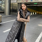 Deze lange gewatteerde jas zonder mouwen biedt een perfecte mix van warmte en stijl. Met een klassieke gewatteerde textuur, een capuchon en een comfortabele pasvorm is dit een veelzijdig item dat je moeiteloos over je favoriete outfits kunt dragen.