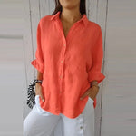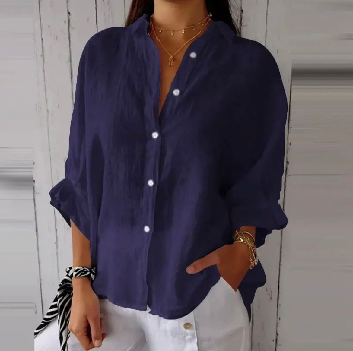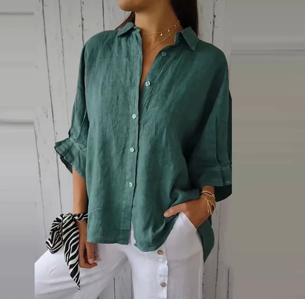 Deze blouse is gemaakt van een zachte katoenmix en houdt je de hele dag comfortabel. Je hoeft je niet meer beperkt of bezweet te voelen. De losse pasvorm en driekwart mouwen zorgen ervoor dat je koel en ontspannen blijft, waar je dag je ook brengt. Comfort en stijl gaan naadloos samen.