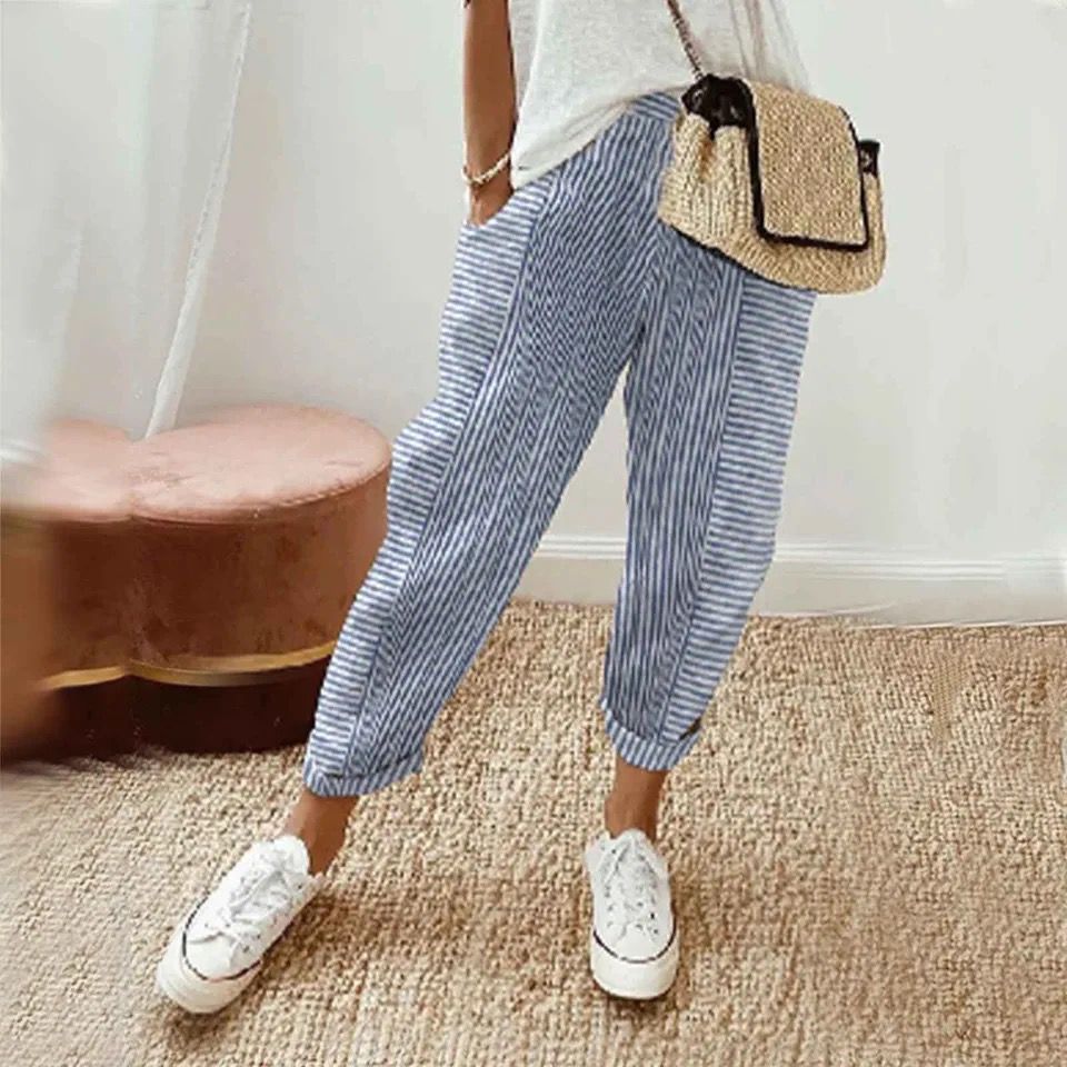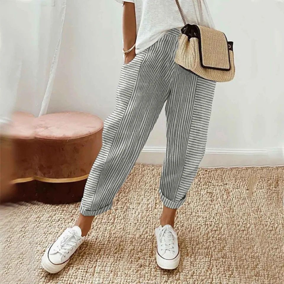 Deze broek biedt niet alleen comfort, maar heeft ook een chic streepdessin waarmee je er moeiteloos modieus uitziet. Of je nu een casual dag, een wandeling in het park of een ontspannen avond met vrienden hebt, de Yara™ Chique zomerbroek is veelzijdig genoeg voor elke gelegenheid.