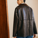 De Sofia leren jas verenigt klassieke elegantie met comfortabele warmte. De glanzende zwarte afwerking in combinatie met de zachte bruine teddyvoering maakt het een onmisbaar stuk voor koele dagen en stijlvolle optredens.