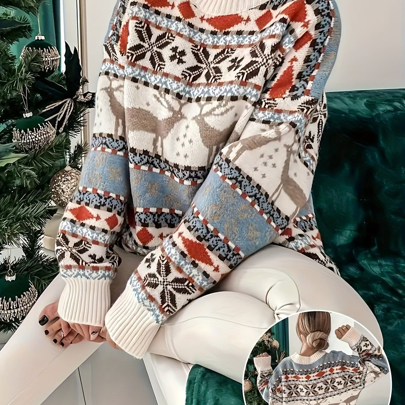 Dames Oversized Jacquard Gebreide Trui met Hertpatroon