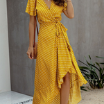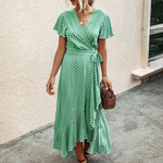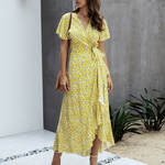 Dit vrouwelijke wikkeljurk met bloemmotief is de perfecte mix van elegantie en luchtigheid. De V-hals, de korte ruffle-mouwen en de asymmetrische zoom zorgen voor een charmante, luchtige look die je door warme dagen begeleidt – of je nu aan het winkelen bent, op reis of naar een zomerfeest gaat.