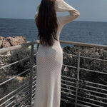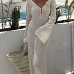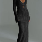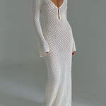 Het Greta Maxikleed verenigt casual Boho-stijl met verfijnde elegantie. De diepe V-hals met knoopdetail accentueert het decolleté perfect, terwijl de luchtige haakstructuur zorgt voor een chique & zomerse afwerking. De wijde belmouwen & de getailleerde pasvorm geven dit breikleed een stijlvolle, vrouwelijke touch – ideaal voor stranddagen, zomerfeesten of elegante resortlooks.