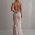 Xenia | Elegante Rugloze Satijnen Maxijurk met Bloemapplicaties