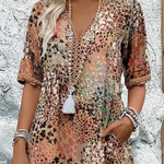 Dit kniehoge zomerkleed met V-hals biedt stijlvolle lichtheid voor modebewuste vrouwen van alle leeftijden. De luchtige snit, het kleurrijke patroon en de praktische zijzakken maken het de ideale metgezel voor vakantie, dagelijks leven en vrije tijd.