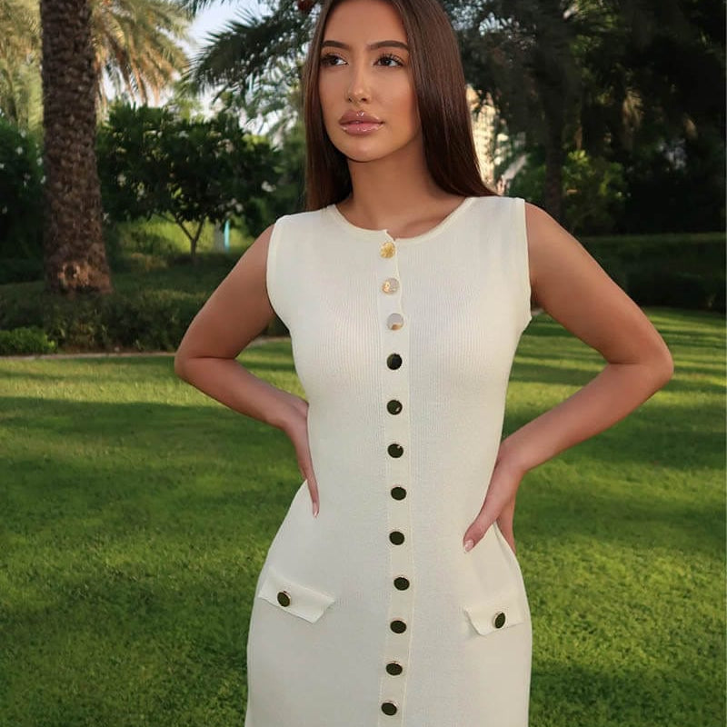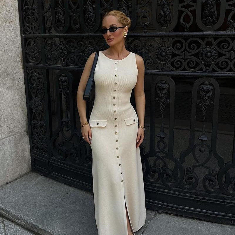 Rosamund | Elegante Knopdetail Mouwloze Maxijurk – Tijdloze Klasse & Raffinement