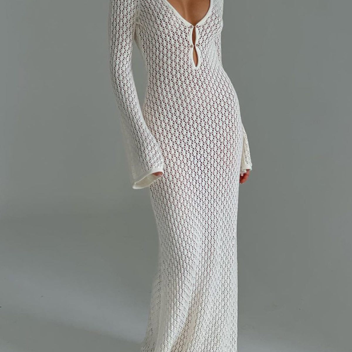 Greta | V-hals Gehaakt Maxikleed met Belmouwen – Boho-Chic voor de Zomer