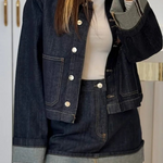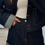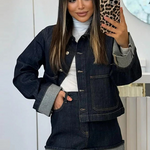 • Modieuze snit: Korte jeansjacke en minirok met brede omslagen voor een coole look.