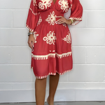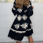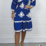 De jurk heeft een licht uitlopende rok en een elastische tailleband die de vrouwelijke silhouet prachtig benadrukt. Het bijzondere patroon geeft de look een trendy Boho-chic uitstraling.