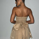 Dit betoverende minikleed combineert eenvoudige elegantie met een opvallend glittereffect. Het schouderloze ontwerp en de geraffineerde borstpartij benadrukken de vrouwelijke silhouet, terwijl de uitlopende rok zorgt voor een speelse en elegante touch. Perfect voor glamoureuze avonden of speciale gelegenheden waarop je wilt stralen.