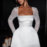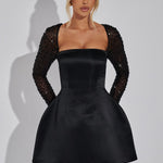 Dit elegante mini-kleed combineert eenvoudige verfijning met sprankelende details. De glanzende, transparante mouwen zorgen voor een glamoureuze uitstraling, terwijl de gestructureerde rok het kleed een volumineuze en elegante silhoët geeft. De off-shoulder snit met duidelijke, moderne lijnen maakt het een perfecte keuze voor speciale gelegenheden.