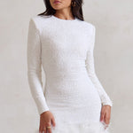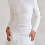 Deze minimalistische en elegante halsloze minijurk wordt verrijkt door een luxueuze verenrand. De eenvoudige, figuurvormende snit zorgt voor een tijdloze silhouet, terwijl de verenrand een vleugje glamour en speelsheid toevoegt. Ideaal voor elegante avondgelegenheden of stijlvolle feesten.