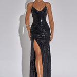 De Dyonne jurk is gemaakt voor grote optredens en onvergetelijke nachten. Volledig bezet met zwarte, lichtreflecterende pailletten, trekt deze avondjurk alle blikken naar zich toe. De fijne spaghetti bandjes, de vrouwelijke V-hals en de getailleerde snit zorgen voor een sensuele silhouet, die nog extra wordt benadrukt door de hoge beeninsnijding.