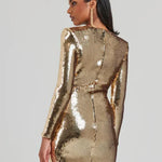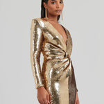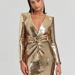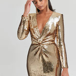 Deze pailletten lange mouw jurk met plissé-design is een gedurfde en elegante keuze voor elke feestelijke gelegenheid. Het glinsterende gouden ontwerp trekt onmiddellijk alle aandacht, terwijl de diepe V-hals en het flatterende plissé-detail een verfijnde en trendy uitstraling geven. De lange mouwen creëren een perfecte balans met de mini-lengte, waardoor de jurk zowel stijlvol als feestelijk is.