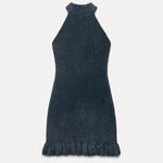 Deze elegante minijurk valt op door zijn vrouwelijke silhouet en verfijnde details. De ingewerkte parelappliqués geven de jurk een subtiele, maar edele glans, terwijl de speelse gerimpelde zoom een vleugje luchtigheid toevoegt. De mouwloze snit en de hoge kraag zorgen voor een moderne en stijlvolle uitstraling.