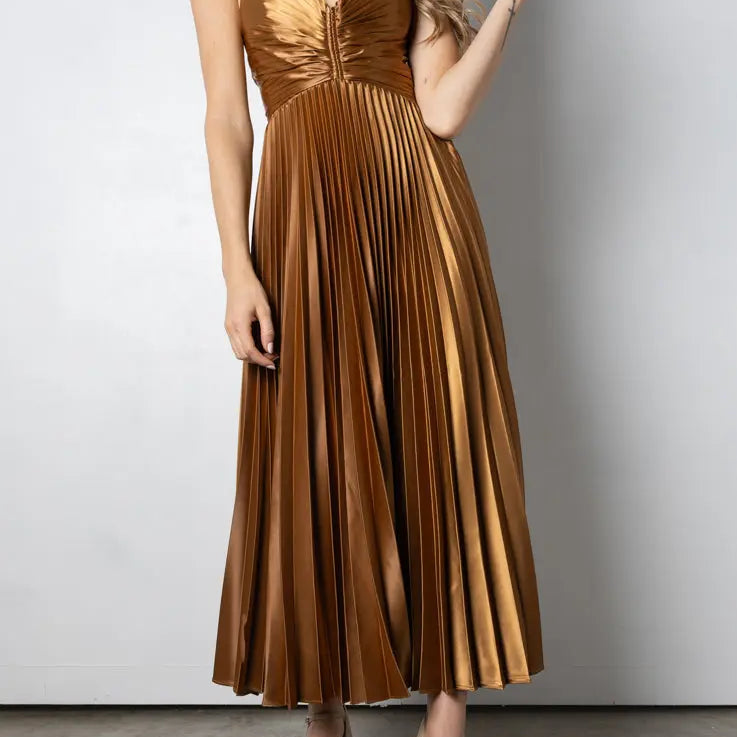 Crystal | Mouwloos Knopen Bruin Linnen Midi-jurk met figuuraccentuerende pasvorm