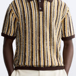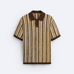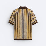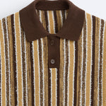 Dit stijlvolle gebreide poloshirt in retro-look valt op door zijn unieke verticale strepenpatroon in warme aardetinten. Het gestructureerde ontwerp zorgt voor een trendy vintage-touch, terwijl het hoogwaardige materiaal maximaal comfort biedt. Perfect voor mannen die een individuele en toch elegante stijl verkiezen.