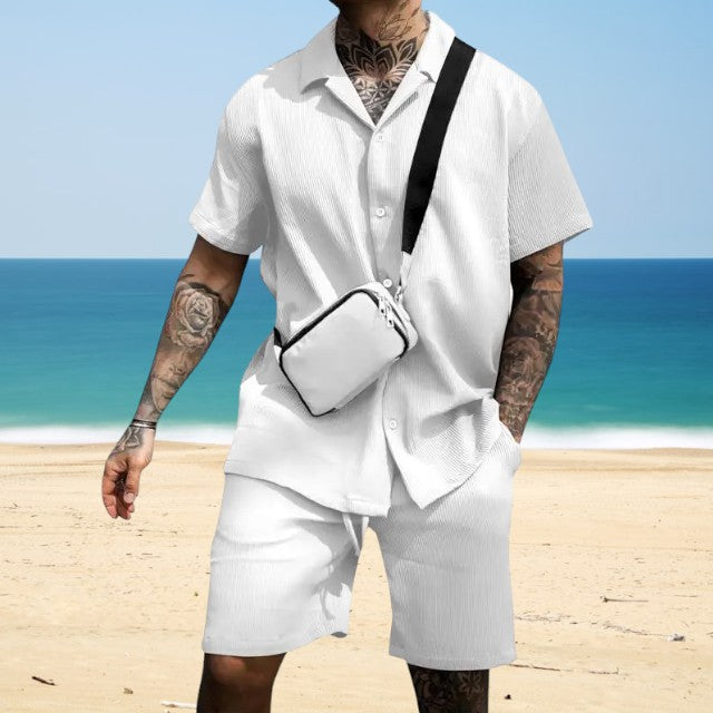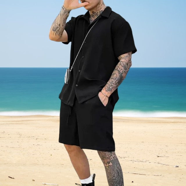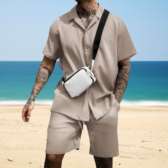 Maak kennis met de Hugo™ Zomerset, ontworpen om er goed uit te zien en je koel te voelen. Deze set is gemaakt van ademende materialen en bestaat uit een overhemd met knoopsluiting en een bijpassende korte broek, perfect voor elke zomerse gelegenheid. Met zijn effen kleuren en casual chic ontwerp zorgt deze outfit ervoor dat je comfortabel blijft terwijl je er op je best uitziet, of je nu naar een strandfeest of een business casual evenement gaat.