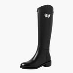 Deze tijdloze rijlaars van glad, hoogwaardig leer overtuigt door zijn eenvoudige elegantie en het luxe metalen sluitdetail aan de bovenkant van de schacht. Perfect voor iedereen die stijl met comfort wil combineren.