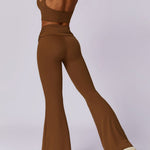 Deze mokkatint flared broek is de perfecte basis voor moderne elegantie en comfort in elke garderobe.
