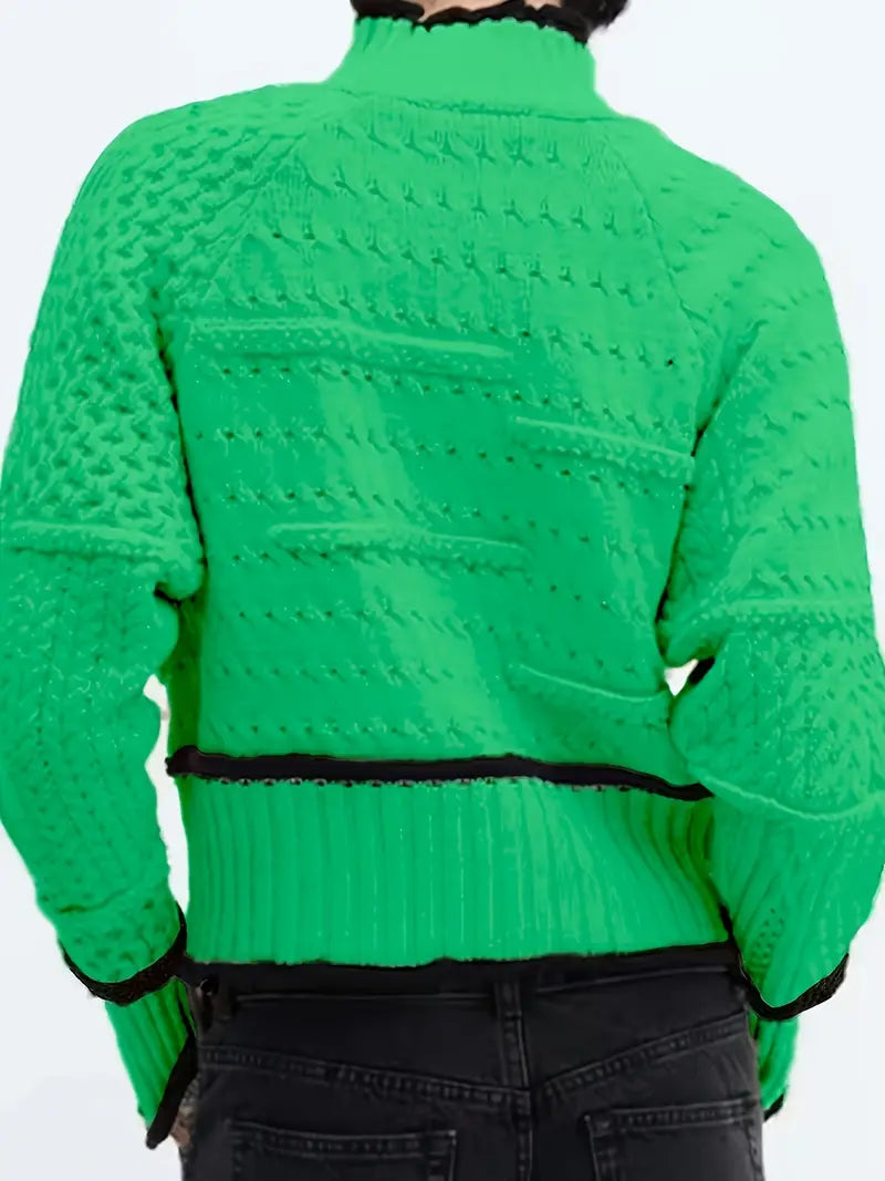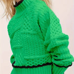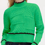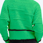Deze trendy damestrui in felgroen is een echte eyecatcher in je garderobe. Het unieke kabelpatroon voegt textuur en stijl toe, terwijl de contrasterende zwarte details zorgen voor een modern accent.