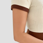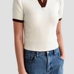 • Ontwerp: Korte mouwen, geribbelde structuur, contrasterende kraag.