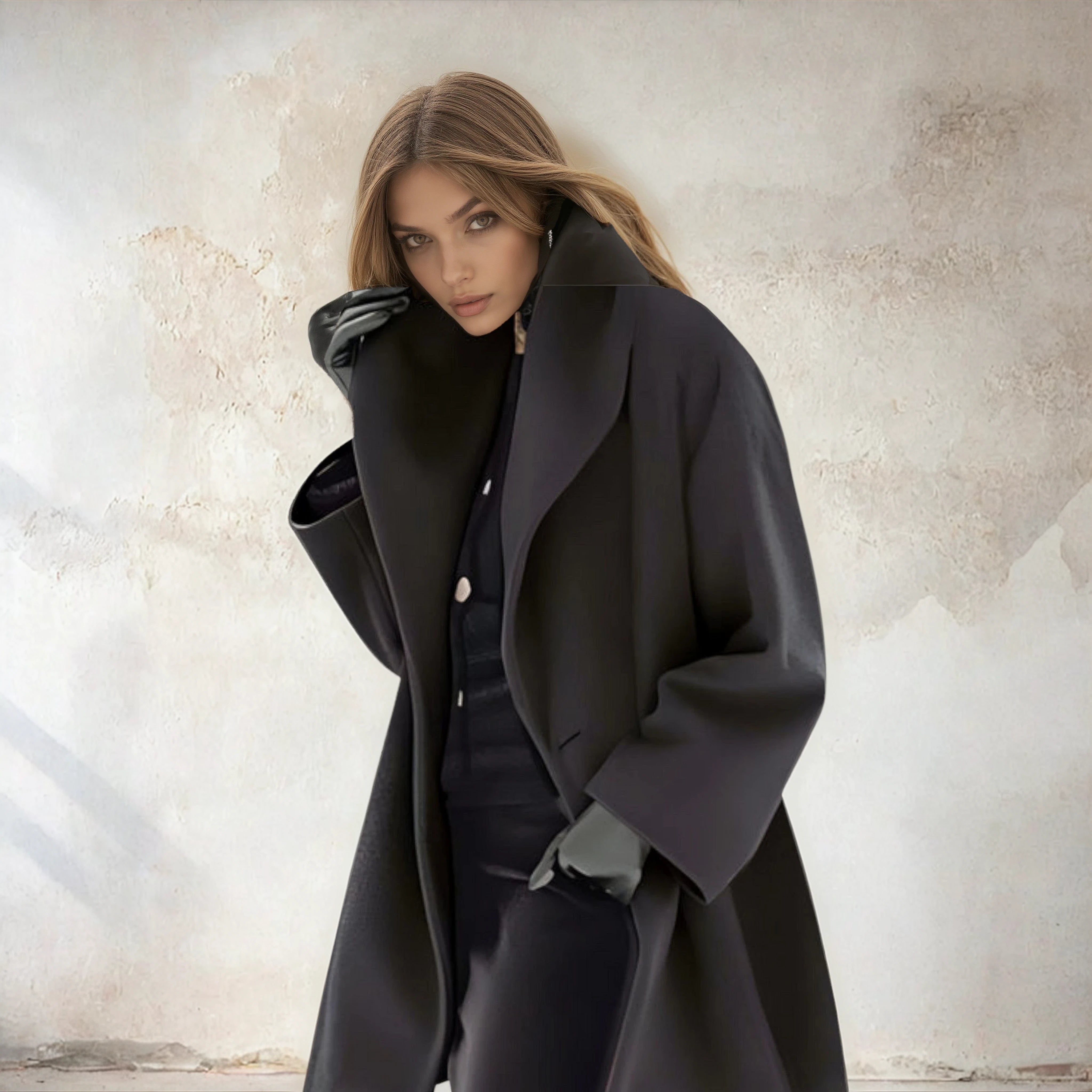 Deze oversized elegante jas is de perfecte combinatie van comfort en verfijning. De royale pasvorm en de hoge kraag zorgen voor een chique, nonchalante look die moeiteloos te combineren is met verschillende stijlen.