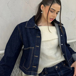 • Modieuze snit: Korte jeansjack en minirok met brede omslagen voor een coole look.