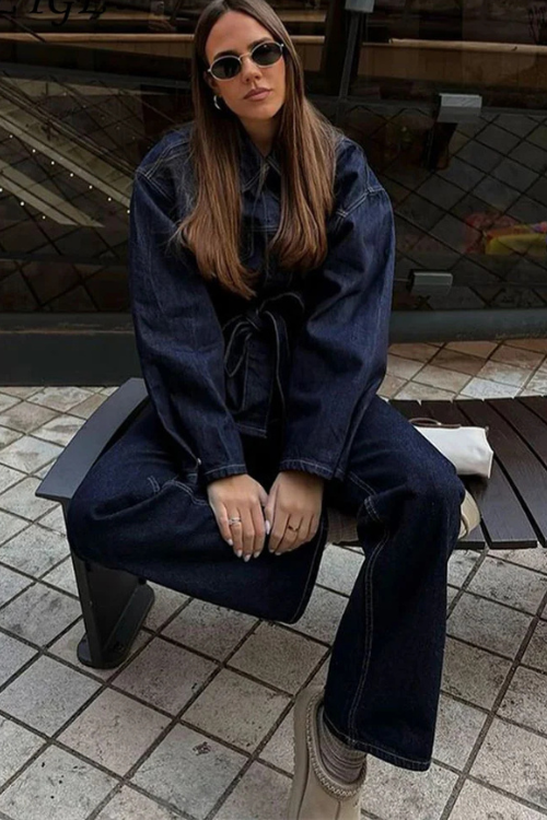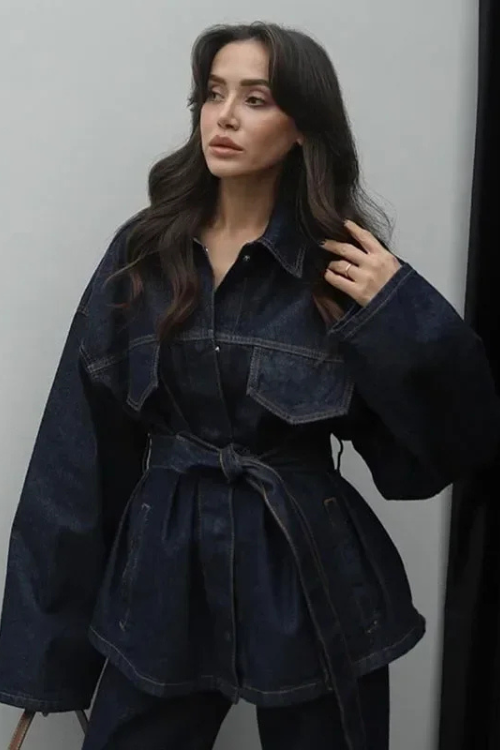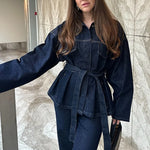 Dames-Denim-Set – Elegante Taillierte Jeansjacke met Ceintuur & Wijde High-Waist Broek