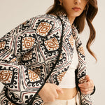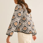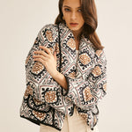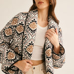 Deze Boho-geïnspireerde zomerjas is een echt statement-stuk voor iedereen die houdt van stijlvolle lichtheid. Het kunstzinnige etnische patroon in zwart, beige en bruin geeft haar een bijzondere uitstraling, terwijl de luchtige, zachte stof zorgt voor maximaal comfort.